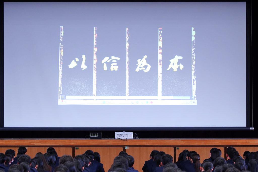 そして、明治41年には本校の創立に多大なご援助をいただいた明治の元勲松方正義侯爵から校旗を授与され、その校旗には「以信為本(意味:信用第一)」の4文字が記されておりました。 以来、学校の変遷とともに校訓も変遷してきました。昭和26年に愛知県立豊橋商業高等学校となってからは校訓が無い時代が続きましたが、創立100周年を迎えるにあたり「校訓」を作ろうと機運が高まりました。平成14年4月9日には、同窓会会長並びにPTA会長出席のもと校訓制定式が挙行され、学校長より生徒に対し校訓の魂が伝達されました。 そして創立100周年記念事業の一環として平成16年4月に校訓旗が復刻しました。